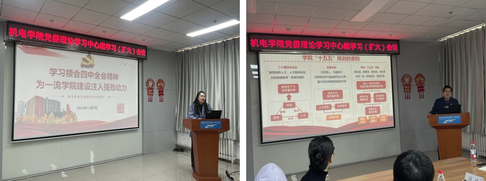 学院党委副书记唐薇领学了二十届四中全会公报,解读了全会精神的核心要义和实践要求。学院党委副书记、副院长蒋增强总结了学院 “十四五”发展成就,介绍了学院 “十五五” 发展规划编制情况。